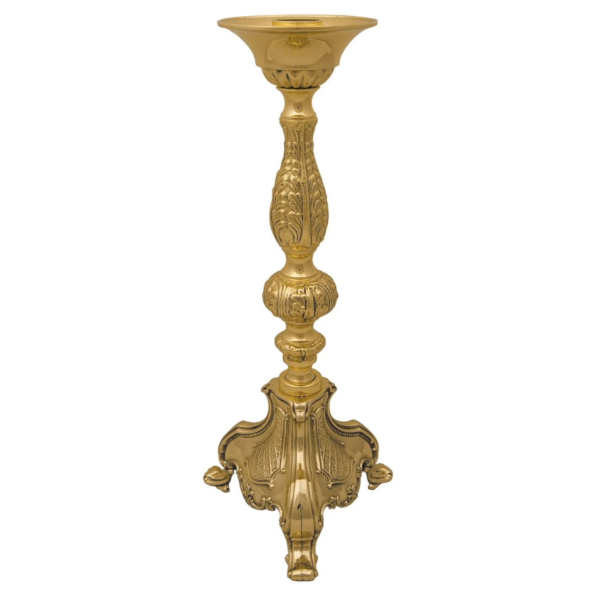 This beautiful baroque style candlestick is made of hand polished brass and would make a fantastic addition to any chapel or church. With ornate detail on the three legs, knop, and stem, it will stand out and add character to any church. At 13″ high with a 1″ socket, it is perfect for holding any
