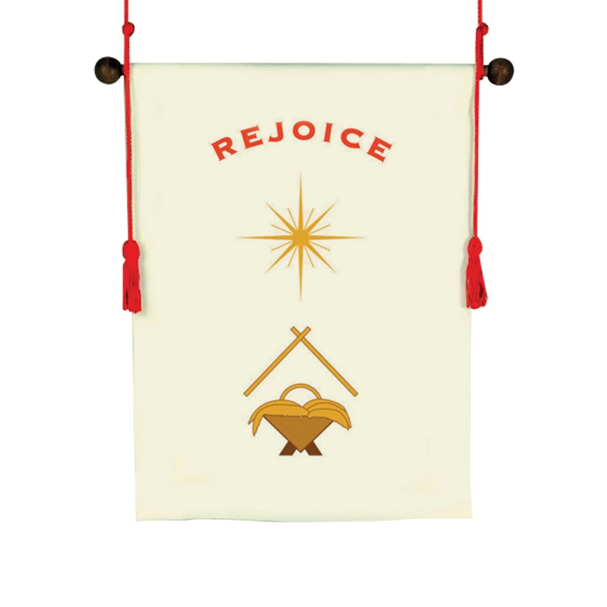 Hanging banner in white with Rejoice and Christmas nativity design.