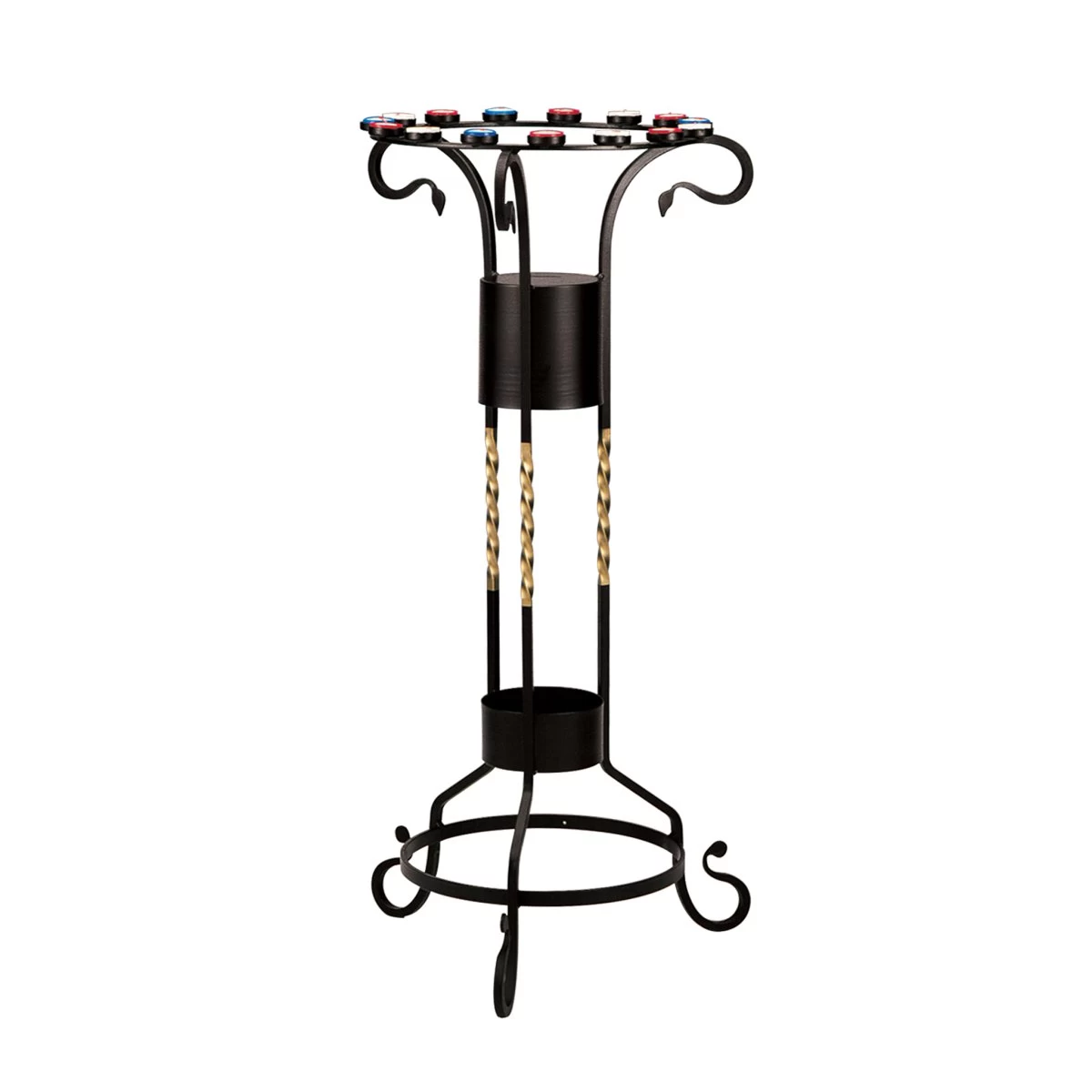 Votive candle stand made in wrought iron, in a circular, flat top design.