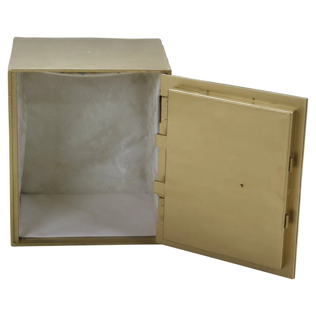 Tabernacle made in steel, with polished brass door plate featuring chalice and host motif design with decorative details.
