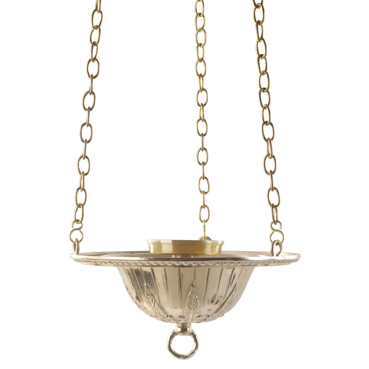 Hanging lamp made in polished brass, featuring dish style design with extended lip around rim.