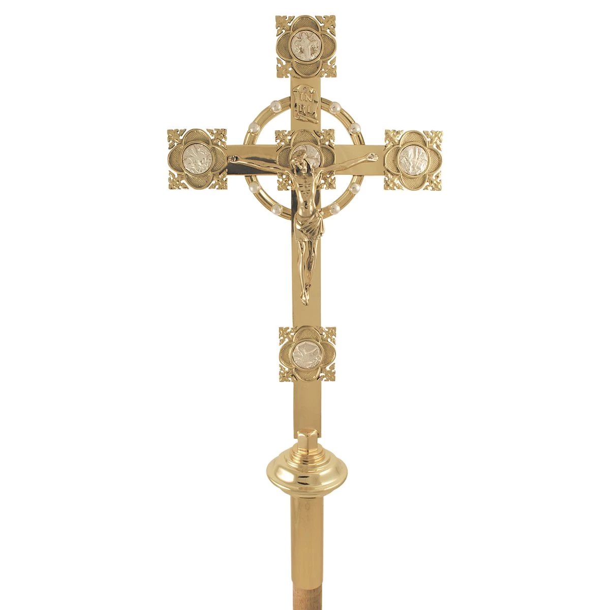 This processional crucifix is perfect for churches looking to add a touch of elegance to their services. The brass construction is polished and features beautiful cast silver-plated motifs of the evangelist and paschal lamb.