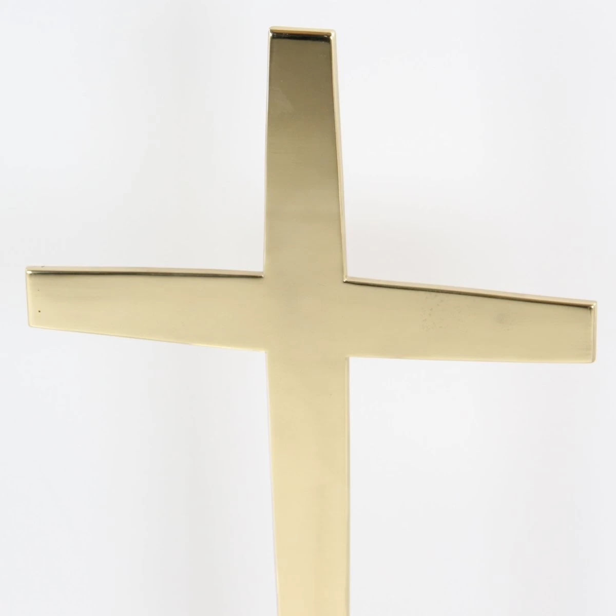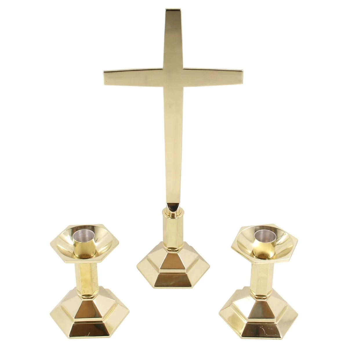 Altar crucifix and 2 candlesticks set made in polished brass, featuring a ornate design and three-legged base.