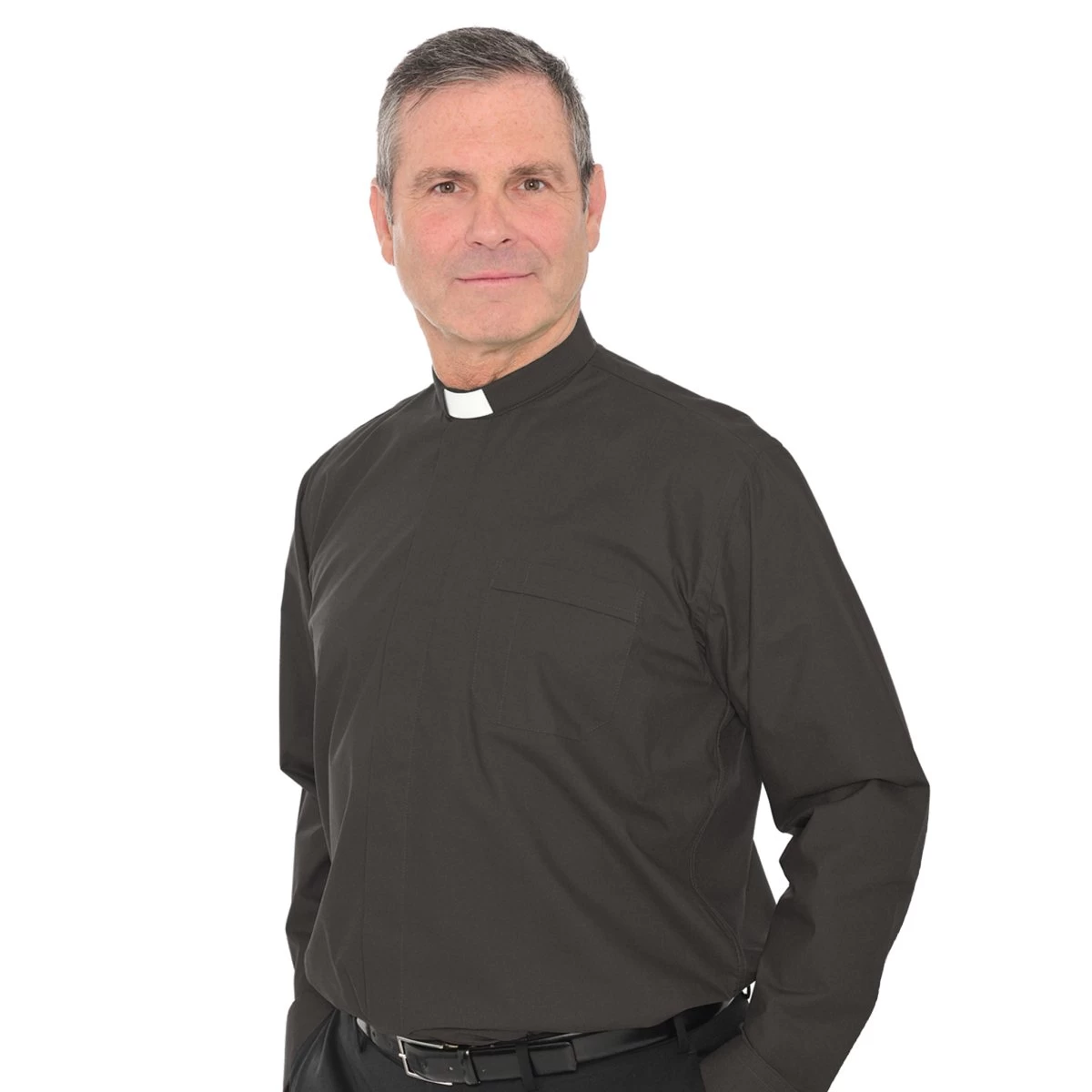 Long sleeve clerical shirt with tunnel collar, made in machine washable polyester cotton from Hammond & Harper of London.