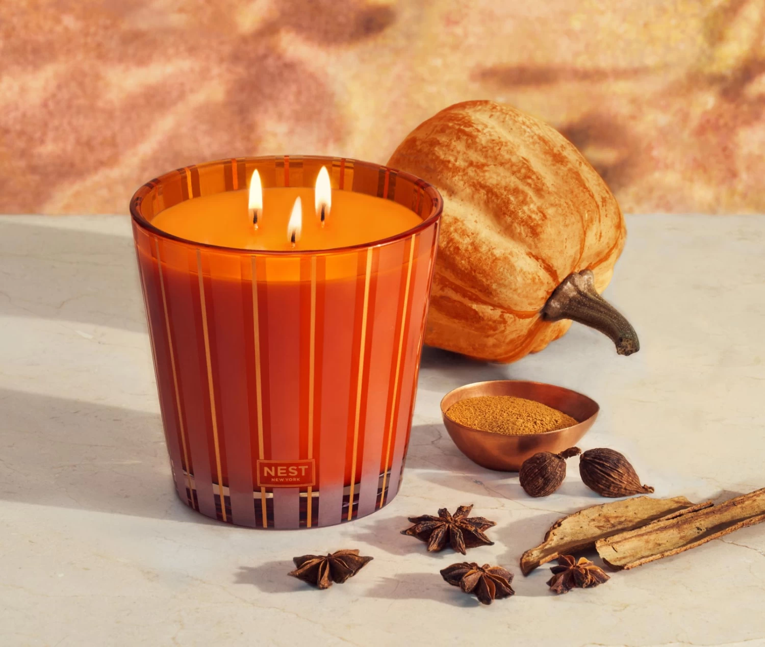 Create a cozy autumn ambiance with this exquisitely fragranced 3-Wick Candle featuring a blend of wild pumpkin, spicy masala chai, cardamom, ginger, and cinnamon.