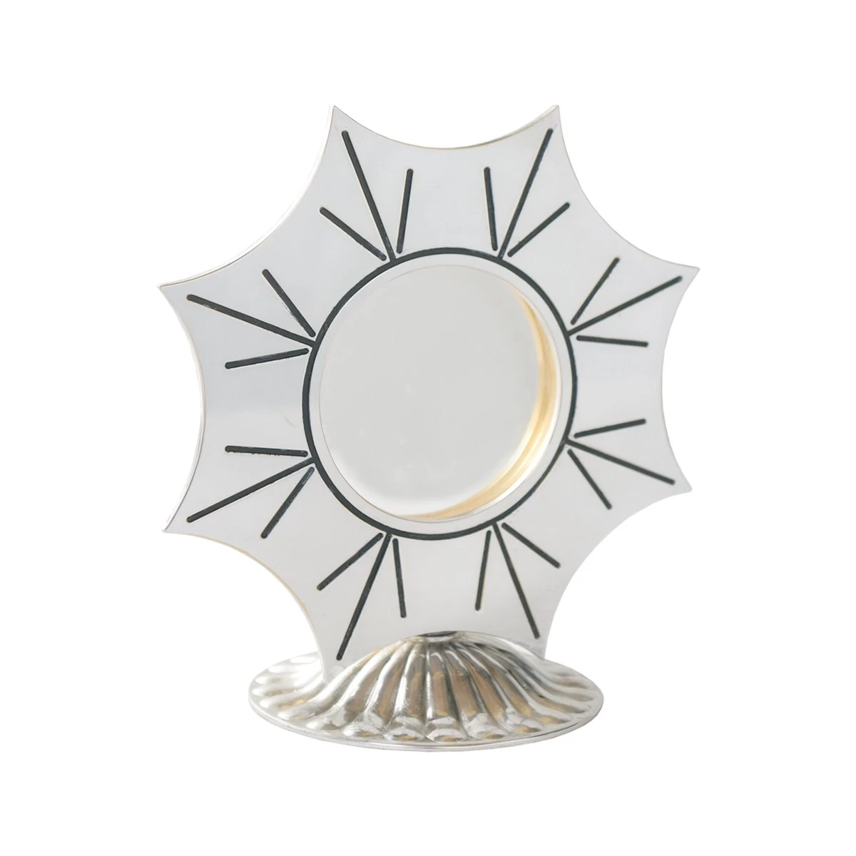 Small monstrance in a sun shape design with engraved detail. The monstrance is the sacred vessel used to contain the Blessed Sacrament, a bread wafer that represents Jesus Christ’s body during the Eucharist mass. It is often used with a small dome-shaped enclosure called a lunette, which contains one or more round openings.