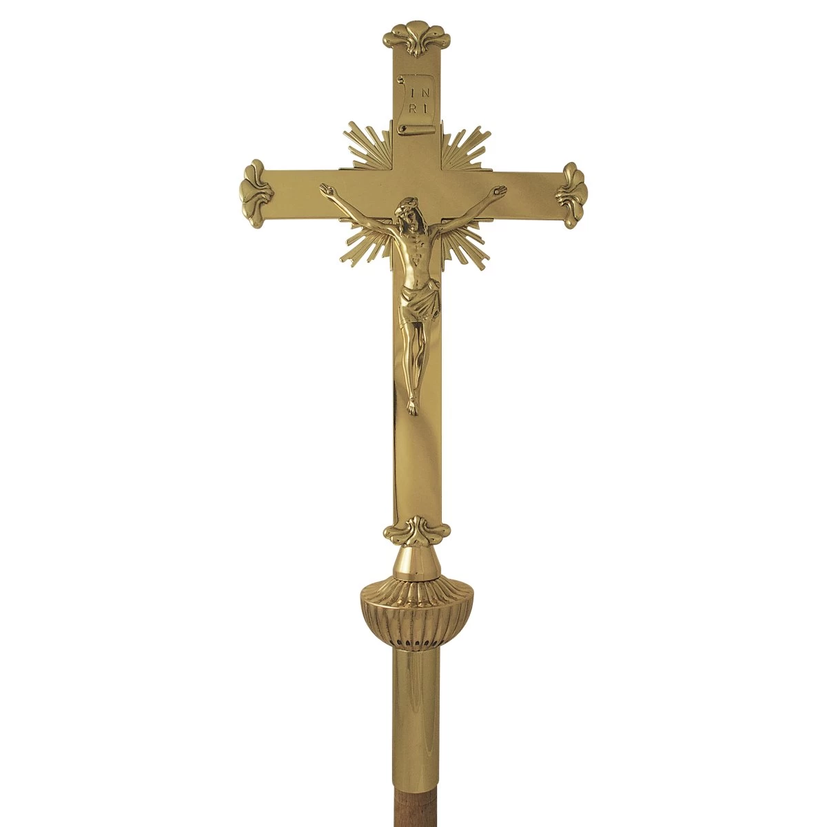This processional crucifix is made of polished brass and shines with a beautiful sun ray design. The ends of the cross and the knop are intricately detailed. The blade size is 17″ high x 10 1/2″ wide, and the fine