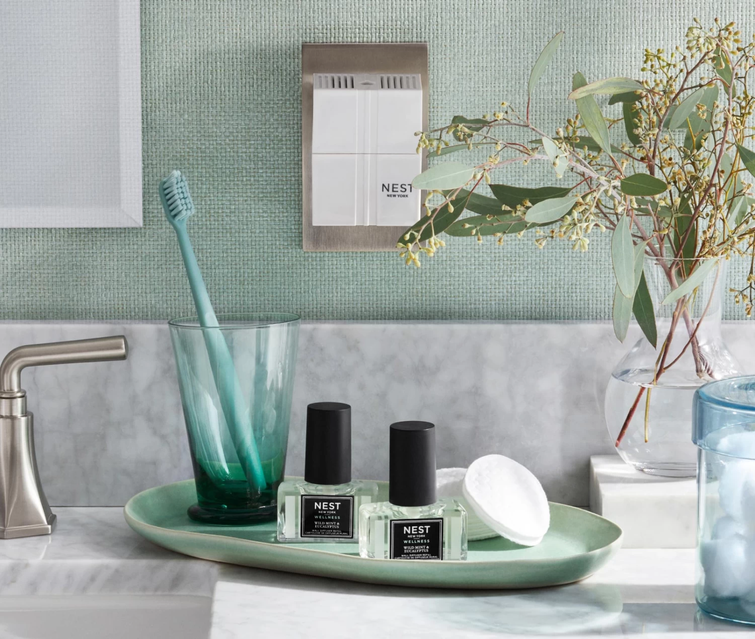 Scent your world with this exquisitely fragranced Wall Diffuser Refill Duo featuring captivating blends of wild mint and eucalyptus with basil and Thai ginger to clear your mind and awaken your senses.
